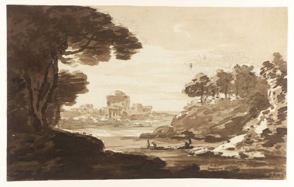 Curator: Alexander Cozens' "Coast Line with Ruined Town, to Left" presents us with a somber scene rendered in monochrome wash. It's incredibly small, measuring only about 10 by 16 centimeters. Editor: There’s a haunting quality to this tiny vista, a sense of decline underscored by those ruins juxtaposed with the natural landscape. I’m immediately drawn to how class and power are implicated in the depiction of decay. Curator: Cozens was known for his "blot" technique—essentially controlled accidents using ink washes—which democratized landscape painting. It allowed for mass production of sublime images, and made them more accessible. Editor: Yes, and considering the period, this accessibility opens doors to discuss the evolving relationship between humans and their environment, class dynamics, and the picturesque movement’s impact on social perceptions. Curator: Seeing the handmade nature, how the ink interacts with the paper, really emphasizes that craft element. It shifts the focus from solely aesthetic appreciation to labor. Editor: Precisely. By examining how ruins symbolize societal shifts, we expose the politics embedded in landscape art. The ruin suggests a lost community, perhaps dispossessed from land. Curator: It's fascinating how Cozens used simple materials to evoke such complex emotions. Editor: Absolutely. It makes you consider the stories of communities displaced or erased over time.