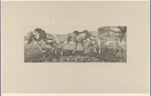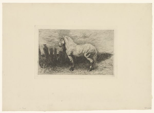 Curator: This is Adolf Eduard Herstein's "Runderen in de weide," which translates to "Cattle in the Meadow," likely created between 1879 and 1932. It's an etching printed on paper and rendered in ink, here in the collection of the Rijksmuseum. Editor: It's moody. Quite evocative, isn’t it? The dark, scratchy lines feel almost… uneasy. Curator: I find that evocative description quite apt, considering the technique of etching. The image begins on a metal plate, where lines are bitten into the surface by acid. The amount of labor that goes into the work to produce different textures is profound. Editor: And the contrast really jumps out. Those heavy inks defining the shapes of the cattle and that slightly blurred foliage in the background…it’s interesting how he chooses to use varying levels of definition, wouldn't you say? It’s like a half-remembered scene. Curator: He certainly uses the materiality of etching to full effect. Look at how he builds depth using cross-hatching to suggest both the density of the cattle’s bodies, but also the shadow of the tree looming nearby. You could say it is representational and documentary of agricultural life and practices of the period, particularly how open land became managed, measured spaces. Editor: Absolutely. It makes you consider all the physical processes: the grain of the paper itself, how it absorbs the ink; the artist’s hand and the pressure applied. The piece emphasizes this connection to the natural world. Curator: Exactly. While the subject is representational of grazing cattle, Herstein is actually making a very conscious choice to engage with realism and also an element of abstraction in those strokes. A scene grounded in earthy reality, then abstracted again and again. Editor: I think I'll carry that “grounded yet abstracted” vision with me, certainly when viewing a different work later. Curator: A lovely intersection of the terrestrial and the artistic, isn't it? Just like the cows themselves are doing as they wander on the plains.