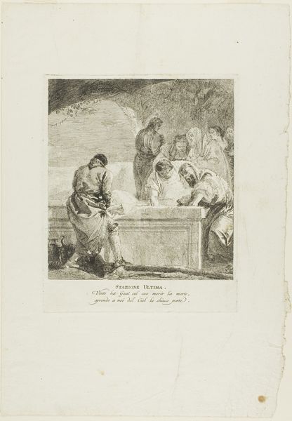 Giovanni Domenico Tiepolo created this etching, titled "The Deposition," which portrays a poignant scene from the Stations of the Cross. Here, we witness the removal of Christ’s body from the cross, a moment laden with grief. Note the ladder, an ancient symbol of ascent but here, tragically repurposed. The gesture of Mary cradling her son echoes the ancient motif of the Pietà, resonating across time and cultures. This maternal embrace, seen in depictions of goddesses and mothers throughout history, speaks to universal themes of sorrow and protection. Such imagery taps into our collective memory, stirring primal emotions. The Pietà, as seen here, isn't merely a depiction of grief; it's a cultural touchstone that has resurfaced repeatedly, each time coloured by new historical and psychological nuances, powerfully engaging us on a subconscious level. It’s a motif that perpetually evolves, eternally imprinted in our collective consciousness.
