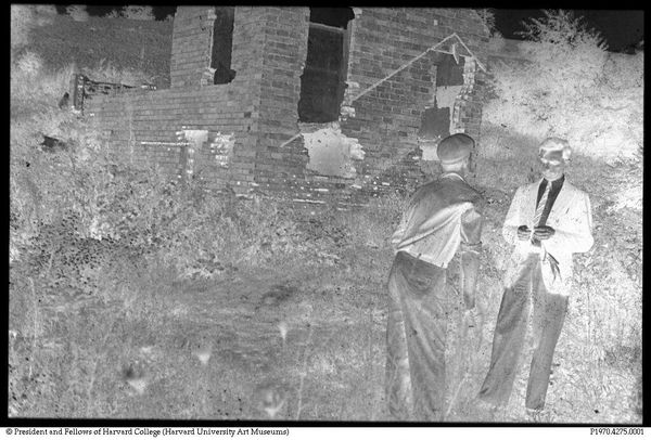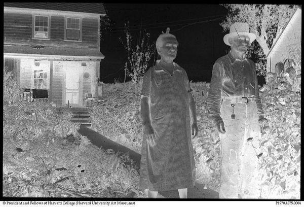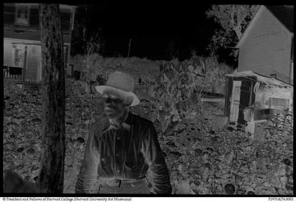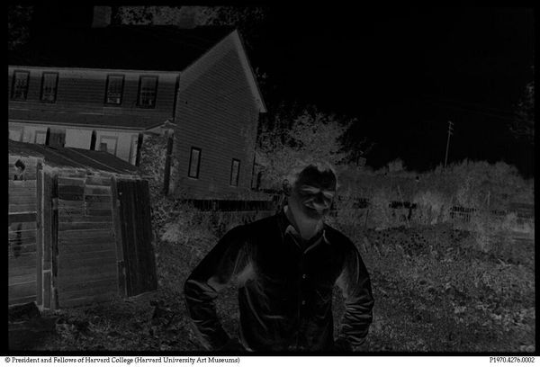 Editor: Here we have a gelatin silver print, attributed to Bernarda Bryson Shahn, titled *Untitled (Mr. Kollar, Hungarian miner, Calumet, Pennsylvania)*. It's quite small, almost like a snapshot, and the darkness gives it a solemn feel. What do you see in this piece? Curator: I see a powerful statement about labor and immigration in early 20th-century America. The composition places Mr. Kollar, likely an immigrant worker, between the domestic sphere and his labor, suggesting themes of belonging and displacement. It invites questions about the lives of immigrant laborers and their families. What does that suggest to you? Editor: I see what you mean. The way he’s positioned makes him seem almost trapped between two worlds, carrying the weight of both. Thanks for pointing that out. Curator: Absolutely. Understanding the context allows us to appreciate the complexities of identity and the struggles of marginalized communities.