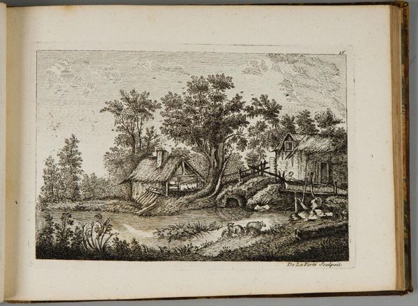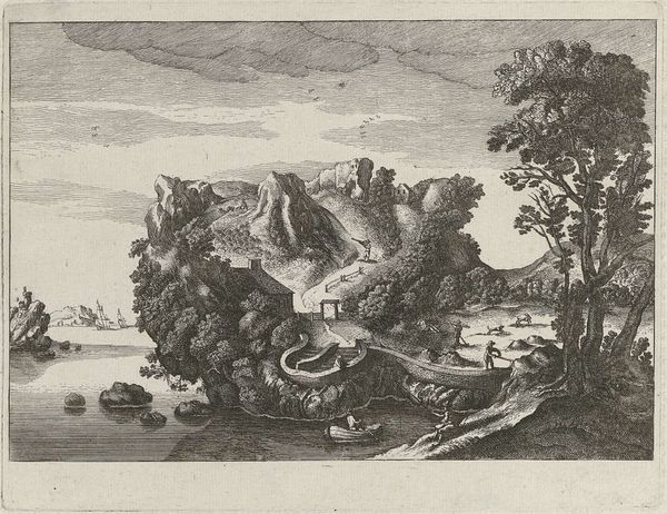 Editor: This etching is titled "The Samaritan Arrives at the Inn" by Simon Frisius. It's amazing how much detail he gets with just lines. I'm struck by the composition, how the inn seems both a refuge and somehow vulnerable within the landscape. What do you see in this piece? Curator: The Good Samaritan narrative is so core to understanding early modern ethics. Frisius, working during a period of intense religious and social upheaval, uses the landscape to amplify the story's themes. Consider how the inn is positioned between wild nature and cultivated land. Does that placement suggest something to you? Editor: Maybe, like, the inn is this place of transition, where different social worlds meet? Curator: Precisely. It becomes a site where compassion can bridge divides. Frisius reminds us that acts of kindness, especially toward the marginalized, can transform societal landscapes. I like how you consider the details. Editor: It’s true. I hadn’t really thought about the landscape like that before. Thanks!
