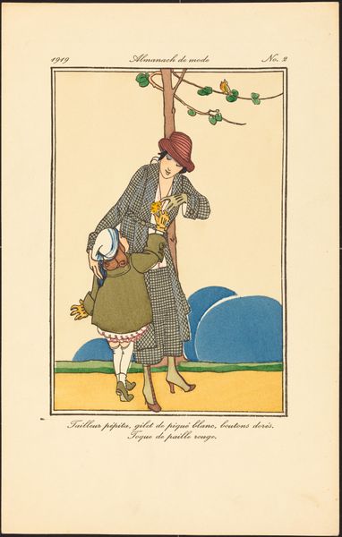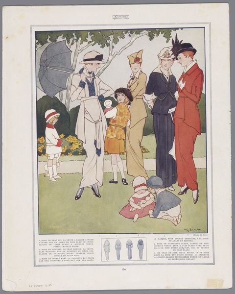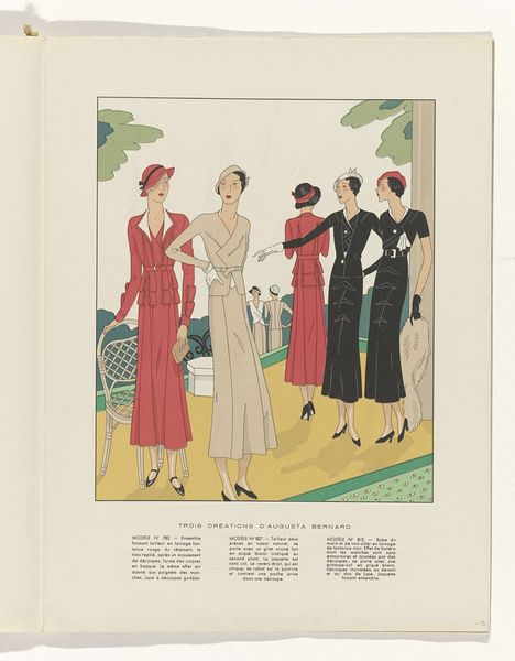 Curator: Immediately, the muted color palette strikes me. It has a subtle melancholic feel, almost sepia-toned despite the pops of pastel blues and yellows. Editor: Today, we are looking at "Art-Goût-Beauté, 1924: Gringallet - Tailleur de lainage (...)," from 1924. While the artist is anonymous, this piece resides in the collection of the Rijksmuseum, providing a window into the fashion and aesthetic sensibilities of the Art Deco period. Curator: Yes, and these figures, arranged almost like mannequins, stand poised beside what appears to be an early automobile. Notice how their clothing seems to both define and constrict them, reflective of a society caught between tradition and modernity? Editor: Indeed. Fashion periodicals like "Art-Goût-Beauté" played a crucial role in shaping those very ideals of modern womanhood. They weren't just showcasing clothes; they were presenting aspirations and projecting social status. These publications promoted and democratized haute couture designs in interwar Europe. Curator: I find it compelling how the artist emphasizes repeated shapes – the circles of the wheels, the hats, echoed even in the stylized foliage in the background. This repetition gives a sense of stylized harmony, yet each character embodies a subtly different version of contemporary feminine identity. Do you sense any tensions in how they are portrayed? Editor: Absolutely. There is a push-pull visible here, a negotiation between classicism and modernity. The women exude confidence, but it is also very much on display – part of a broader social theatre where appearances mattered immensely. Moreover, the work raises interesting questions about how these kinds of publications defined and sometimes limited ideas of beauty and worth for women. Curator: It's true, it encapsulates a transient, delicate beauty...a snapshot of ideals that, like fashion itself, are perpetually changing and being reshaped through visual culture. Editor: Indeed. A stylish glimpse into a bygone era, raising lasting questions about the presentation and consumption of culture and beauty.