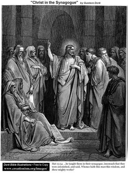 Curator: Gustave Doré's engraving, titled "The Widow's Mite," certainly possesses a somber, weighty atmosphere from the start. Editor: Absolutely. The stark contrast between light and shadow emphasizes a feeling of solemnity and destitution. The way Doré uses line—particularly in the architecture—it creates a scene that's almost claustrophobic, even though it’s an open space. Curator: Doré consistently explored themes of social justice and piety through his art. Here, the piece visually narrates the biblical story from the Gospel of Mark, depicting a poor widow donating two small coins, a "mite," to the temple treasury. Jesus points her out to his disciples as having given more than all the others, because it was all she had. Editor: Observe the careful construction of space. Doré leads our eye from the darkness enveloping the widow to the figures surrounding Jesus. Their placement highlights the relationship of observance of her sacrifice to that which it is offered. The artist used shadow to guide the reading. Curator: Right, and understanding the narrative is key here. Doré is highlighting a fundamental tension. This image asks viewers to consider the worth of generosity rooted in structural inequalities. What does charity mean in a context of systemic injustice, where one's survival is based on their charitable capacity? It suggests the widow’s sacrifice stems from faith amidst economic vulnerability, prompting us to think about socioeconomic and gendered vulnerability. Editor: Interesting. Yet the figure of Christ stands serenely observing. Note how Dore positions the key figures and structures in the frame—this gives great visual power and authority to the place from which Christ proclaims her dedication. What stands out about his depiction, for me, is the clarity and simplicity. Curator: I can appreciate your observations on form and construction. Ultimately, it is Dore’s attempt to prompt reflection on material conditions, faith, and ethical obligations, inviting discourse around charity, precarity, and collective responsibility. Editor: It’s certainly an image that remains striking due to the force and the power within Dore's visual language.