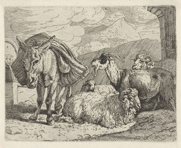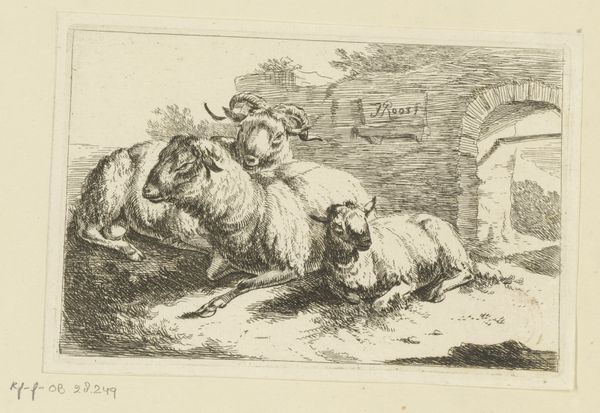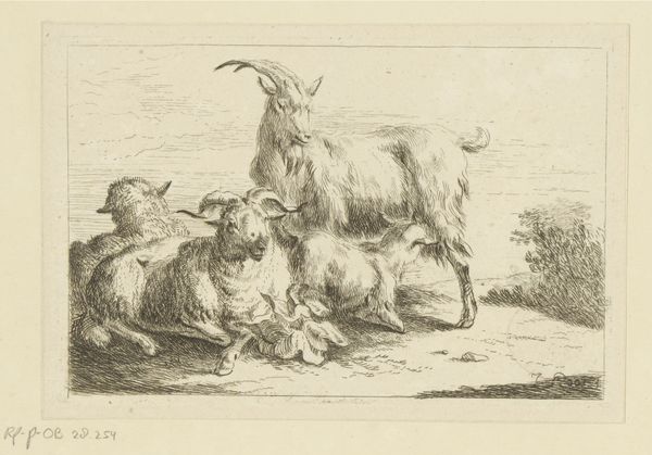 Gerard van Nijmegen made this print of two goats with etching, a popular printmaking technique in the 18th century. The image presents us with a pastoral scene of goats resting, seemingly in a farmer's field, set against a backdrop of trees and what appears to be a simple structure. Created in the Netherlands, this artwork reflects a growing interest in rural life and agriculture that emerged during the period. The print also subtly touches on the economic foundations of Dutch society at the time, where agriculture played a crucial role. The detailed depiction of the goats, complete with their bells, suggests a certain level of care and attention that the Dutch may have afforded their livestock. The work also raises interesting questions about the institutions of art, and who has access to the art world. Understanding this work requires not only an appreciation of its artistic qualities but also an examination of the cultural, economic, and social factors that influenced its creation. This kind of historical understanding can be achieved through careful examination of archival records and other sources.