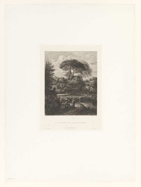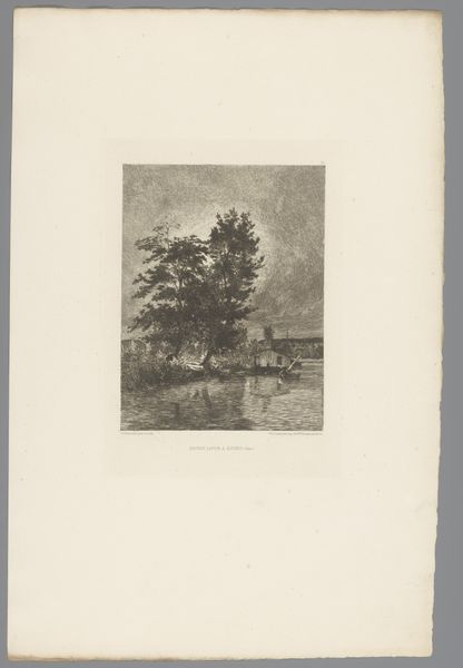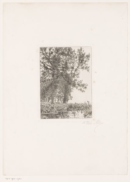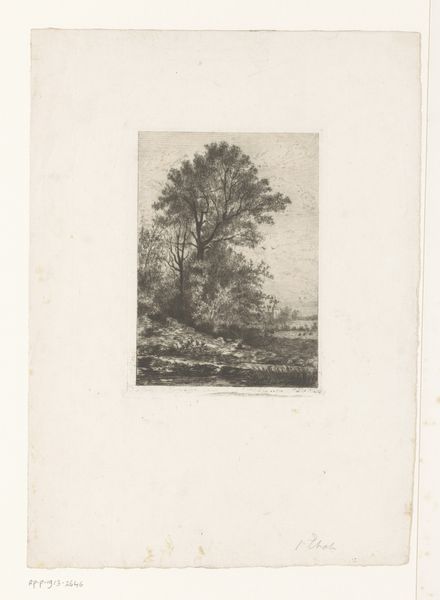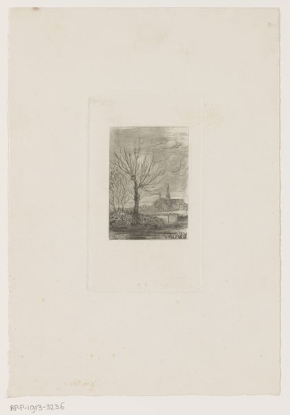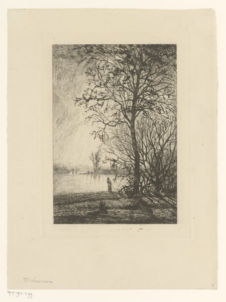 Théodore Tscharner created this small etching, "Ruiter in de schemering", using delicate lines and a subtle tonal range. The composition invites us into a tranquil landscape at dusk, where a lone rider and horse are depicted against a fading sky. The dark foreground contrasts with the emerging light in the background to evoke a feeling of mystery and quiet contemplation. Tscharner's approach to form and structure resonates with the Romantic ideals of the sublime, evoking the emotions through carefully balanced pictorial elements. Each etched line contributes to the overall atmosphere, blurring the boundary between the real and the imagined. The pond in the foreground acts as a mirror, reflecting not just the physical world, but also inviting a deeper meditation on the nature of perception itself. Consider how Tscharner uses the landscape as a semiotic device. By rendering the scene in shades of grey, Tscharner strips away the specificity, inviting us to question what is actually represented. He leaves space for the viewer to project their own interpretation onto the artwork. The meaning then, is not fixed, but relational, arising from the interplay between the artwork and the observer.