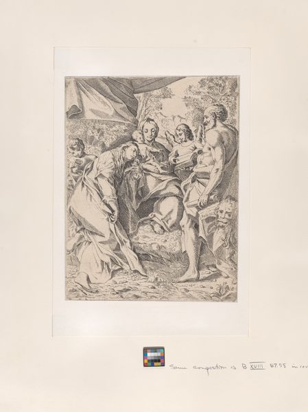 Antoine de Marcenay de Ghuy created this engraving, "Vleugels van Amor worden afgeknipt," sometime in the 18th century. Encased within an oval frame, the composition arranges figures in a scene where Cupid's wings are clipped. The linear precision of the engraving lends a stark clarity to the characters and objects. Observe how the artist uses the stark contrast of dark and light to define form and space. This technique accentuates the emotional tension within the scene. The circular frame further isolates the drama, drawing the viewer's focus into its central conflict. Consider the structural elements at play here. The act of clipping Cupid’s wings might be interpreted as a symbolic disruption. It represents the conflict between love and constraint. This destabilization is reflected in the overall composition, challenging conventional notions of harmony. In its formal construction, the artwork offers a commentary on the constraints placed on desire.