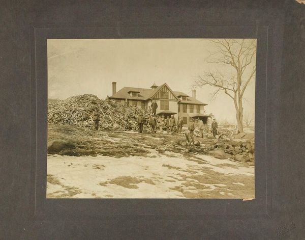 Curator: There's something incredibly haunting about this image titled, "Defectives, Epileptics: United States. Massachusetts. Palmer. State Hospital for Epileptics." It depicts patients preparing wood piles. Editor: Yes, that title is jarring, isn't it? It lays bare the dehumanizing language used to categorize people. The composition is equally stark. Look at the uniformity of the figures. Curator: They're almost swallowed by the landscape, aren't they? The bare trees in the background mirror the stark reality, and the wood pile looms large. There is an almost surreal quality to this scene. Editor: Exactly. And that activity—preparing wood—was likely framed as therapeutic. But we can see that forced labor denies agency and dignity, reinforcing societal biases. Curator: It’s interesting how what seems like a simple depiction of work reveals such a complex web of societal prejudices and institutional control. Editor: Indeed. This image, in its quiet way, speaks volumes about the history of eugenics and the treatment of marginalized groups, something we need to consider as we move forward.