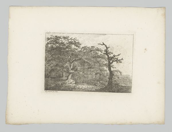 Editor: So this drawing, "Fotoreproductie van een schildering, voorstellende witte abelen," or "Photographic reproduction of a painting, depicting white poplars," is made with ink on paper and dates to before 1876. I’m struck by how the artist captures this grove of trees using very few shades. What do you see in this work? Curator: These are silver poplars or white poplars. Look at how the ink work traces the subtle gradations of light on their leaves. For me, trees have long functioned as symbols of resilience, nature’s capacity to thrive despite adversity, representing continuity between generations and the ties between humans and the landscape. Does the winding and bending of the taller trunks hold any visual or symbolic meaning for you? Editor: Definitely! It's almost as though they're dancing or embracing, an effect achieved by that mirroring composition. What do you mean by ties to the landscape? Curator: These trees appear in Dutch art throughout time to denote home and the familiar world; an attempt to bring the pastoral safety of the past into an uncertain future. But I wonder, how might this photographic reproduction affect the reading of the original painted symbol? Editor: That's fascinating. It almost makes it a symbol of a symbol, adding another layer of removal from nature itself. Curator: Precisely! I find myself contemplating the cultural memory embedded in these seemingly simple landscape elements. Editor: This makes me consider the role of reproduction in shaping our understanding of nature through art. Curator: Yes, the image itself becomes a memory. Thanks, this has really highlighted the artwork's historical weight!