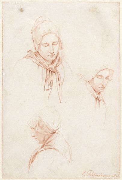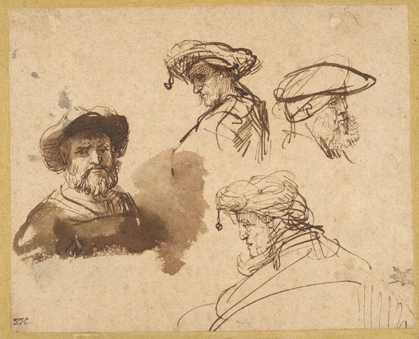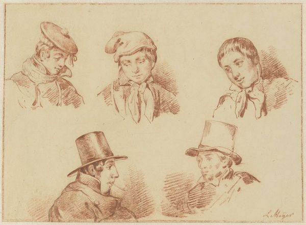 Curator: Welcome. Here we have Johannes Tavenraat's "Mannenkoppen en een vrouwenkop", or "Male Heads and a Female Head", created around 1862. It’s a work on paper employing pen and colored pencil. Editor: Immediately, the overall tonality strikes me—a sort of sepia dream. The variation in line weight creates an intriguing rhythm across the sheet, a compelling dance between precision and fleeting impressions. Curator: Tavenraat, though lesser known today, worked in a period where realism was gaining prominence. It is fascinating to view how these portrait studies might echo social themes emerging in art through emphasis on portraying people accurately. What might seem like casual sketches, thus, open a doorway to understand social interests. Editor: True, yet it is also rewarding to consider the formal relationship among these heads. The composition invites the eye to consider each as an independent study while concurrently noting their shared space. The varying styles of hats, for example, provide structural variance and textual interest to each face and overall organization. Curator: Looking closely at Tavenraat’s technique, it becomes clear that it differs within this single drawing: the crisp strokes delineate the faces, yet others seem to dissipate almost as if light is obscuring their form. We may then appreciate not only what’s represented but the artist’s distinct manipulation of his chosen media. Editor: Yes! I also feel the arrangement contributes strongly to this: grouping the individuals, seemingly arbitrarily. Curator: Indeed. Placed now within the Rijksmuseum, a collection dedicated to showcasing the sweep of Dutch history and its visual arts, “Mannenkoppen en een vrouwenkop” occupies a significant place in revealing both individual skill and trends across that specific artistic tradition. Editor: A striking work. Viewing the detailed construction alongside its tonal effects reveals that Tavenraat possesses the precision for exact renderings while demonstrating unique creative arrangements to present everyday observation into subtle artworks that inspire consideration.