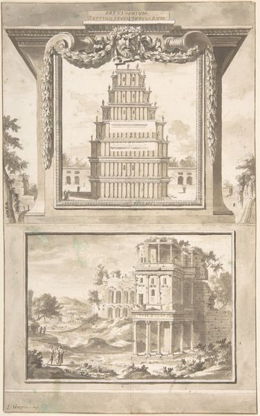 Editor: Here we have Jan Goeree’s "A Reconstruction of the Mausoleum of Augustus (above) and a View of the Ruins (below)," created between 1690 and 1704. It’s an engraving, contrasting an ideal past with a crumbling present. What visual elements strike you most? Curator: The bifurcated composition is indeed the initial focal point. Note the upper register’s pristine architectural rendering, meticulously detailed and symmetrically arranged. Contrast this with the lower register, dominated by fragmentation and a palpable sense of decay. Observe how Goeree utilizes line weight: precise and unwavering above, looser and more gestural below. Editor: So, the formal qualities really emphasize the difference between then and now. Curator: Precisely. The upper image projects an aura of permanence, reinforced by the strong verticality and the ordered tiers. The lower scene introduces a horizontal emphasis, destabilizing the composition and alluding to temporality. Furthermore, consider the use of light and shadow. In the reconstruction, light is evenly distributed, revealing every aspect of the structure. Below, shadow dominates, obscuring details and suggesting incompleteness. What do you notice about the figure in the lower half? Editor: She seems like a classical figure, maybe representing Rome itself? Her gaze is downcast. Curator: Indeed. She introduces a figural element, and what that communicates via contrast when compared with the clean reconstruction. Goeree expertly employs formal devices to convey themes of transience and the inevitable erosion of even the grandest achievements. Do you think that changes our relationship with the image itself? Editor: That’s a strong observation! Seeing how the structure communicates this contrast with something simple like light exposure really opens my eyes to how forms tell stories.