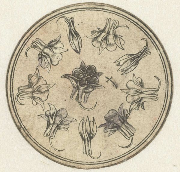 Jacques Vauquer created this floral medallion in the 17th century. The design is densely packed with flowers and foliage, all contained within a perfect circle and a square at its centre. The engraving creates a play of light and shadow, giving depth and texture to the botanical forms. At first glance, it's a decorative piece. However, Vauquer's meticulous attention to detail, the structured layout, and the geometric perfection invite further exploration. The circular boundary and the central square act as formal constraints, setting up a dialogue between the organic and the geometric. The composition echoes the era's interest in categorizing the natural world. The central square could be interpreted as a signifier, a symbol of order. Consider also how this design might function within its intended context, perhaps as a model for artisans. Ultimately, the medallion is not just a pretty picture, but a carefully constructed demonstration of control, design, and the interplay between nature and geometry.