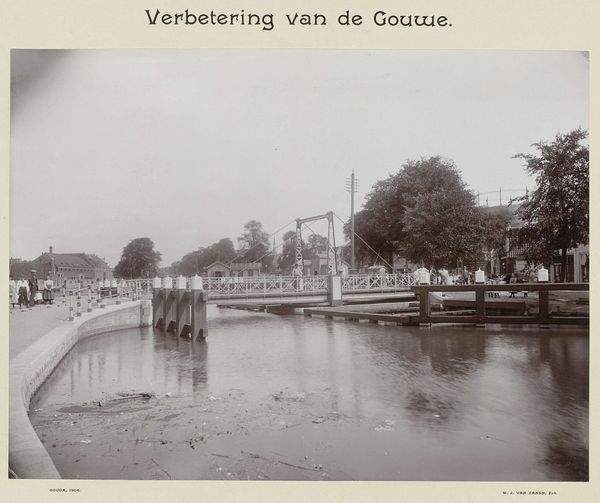 Editor: This gelatin silver print, "Verbetering van de Gouwe," was created by Weijert Jan van Zanen in 1904. It has a very quiet, almost melancholy mood. What strikes me most is the vastness of the sky compared to the sliver of land. How do you interpret this work? Curator: The photograph holds a powerful, almost understated symbolism. Consider "Verbetering"—improvement. What are we improving here? Visually, the Gouwe is being widened, reshaped. This evokes a sense of imposing order onto nature, a common theme throughout history tied to our psychological need for control. Do you notice the tones and how the artist's technique creates a certain texture? Editor: Yes, the soft focus almost romanticizes the scene, but there's also something unsettling about it. The title suggests progress, but the image feels static. Curator: Exactly. It presents a tension between aspiration and reality. The wide river reflects a changed landscape. The symbolism of water is complex, simultaneously representing purification, life, and, if uncontrolled, destruction. Are we really improving the landscape by altering it? Or are we simply rearranging it to fit a different symbolic narrative? This piece reminds me that even seemingly neutral landscape photography carries heavy cultural and psychological weight. Editor: I never thought about landscape in those terms, as loaded with intent and cultural memory! Curator: Photography is so powerful. Editor: This has definitely changed the way I will look at photographs now. Thanks.