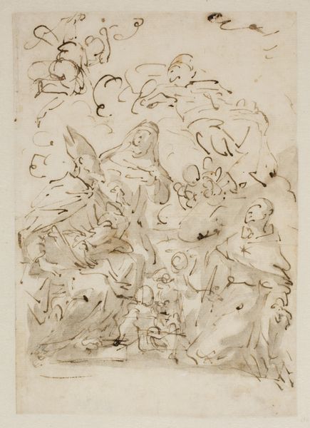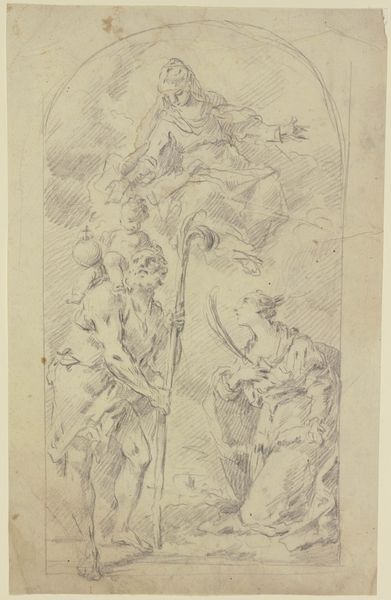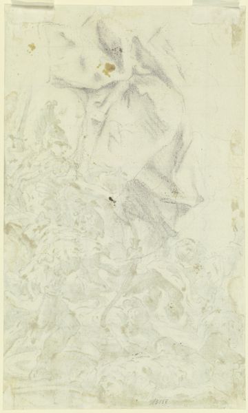 Hendrik Krock created this drawing of Saint George fighting the dragon. Its dimensions are 400 by 273 millimeters. In this delicate sketch, Krock uses graphite to create a dynamic composition. Notice how the swirling lines and shading give form to the figures of Saint George and the dragon, locked in combat. The ethereal quality of the drawing, with its subtle gradations of tone, enhances the fantastical nature of the scene. The arrangement of figures, with the saint poised above the dragon, creates a sense of tension. The dragon's snarling face and the saint's determined stance are captured through quick, expressive strokes. Krock's attention to the play of light and shadow adds depth and drama, drawing us into the heart of the mythical struggle. Consider how the absence of strong, defined outlines contributes to the overall effect. The sketch emphasizes movement and transformation, reflecting the baroque interest in capturing moments of intense emotion and dynamism.