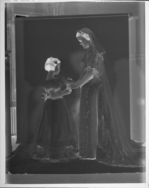 This photographic portrait, made by Paul Gittings, captures a woman in a formal dress next to a candelabra and a zebra-striped wall. Gittings uses a high contrast to create a dramatic, almost theatrical effect. The woman is bathed in light, her dress appearing as if spun from moonlight, edged with delicate lace. It's interesting how the texture of the zebra-striped wall behind her creates a kind of visual dissonance, a clash of the wild and the refined. The candelabra, ornate and classical, adds another layer to this strange mix. Look at how the light catches the woman’s hand, poised thoughtfully near her face. It’s a gesture that speaks volumes, hinting at a complex inner life. The surface of the photograph itself is smooth, almost velvety, which enhances the dreamlike quality of the image. The overall effect is unsettling, but also deeply compelling. This photograph feels like a conversation between Man Ray and Diane Arbus, an exploration of glamour and the uncanny. Like all good art, it leaves you with more questions than answers.