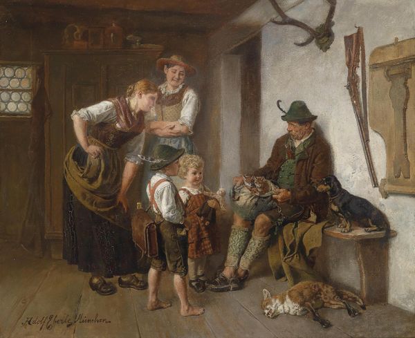 Christian Andreas Schleisner painted ‘In a Coppersmith’s Workshop’ depicting a slice of 19th-century Danish artisan life. Schleisner, active during Denmark's Golden Age, captured the era's fascination with everyday life and national identity. The painting presents a coppersmith in his workshop, seemingly interrupted by a woman, perhaps his wife, while apprentices exchange whispers. Consider the gendered roles here: the man as the artisan, the woman as the domestic figure, subtly challenging or reinforcing the social norms of the time. The whispering apprentices inject a sense of youthful mischief, perhaps hinting at the tensions between labor, learning, and social hierarchy. Schleisner invites us to reflect on the value and dignity of labor. The painting is not just a snapshot of a workshop; it is a carefully constructed narrative about work, family, and community.