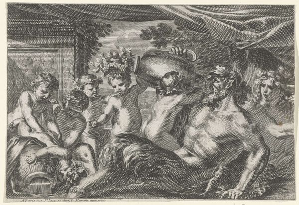 This print, “Oktober: Bacchus die wijn drinkt,” resides here at the Rijksmuseum, and was made by an anonymous artist. The image presents a scene dominated by strong contrasts of light and shadow, typical of the era's engagement with chiaroscuro. The composition is structured around the central figures of Bacchus and a supporting character, possibly a servant or companion, set against a backdrop suggestive of a wine cellar. The forms are rendered with a precise attention to detail. Notice the texture of the grape leaves and the musculature of Bacchus which brings a tactile quality to the image. This emphasis on form and texture ties into broader artistic concerns of the period, where the representation of physical reality was intertwined with symbolic and allegorical meanings. The act of wine-drinking itself can be interpreted through semiotic systems, where the cup, the wine, and the inebriated state all function as signs. Together they form a larger commentary on pleasure, excess, and the transformative powers of art and nature. The use of the wine cellar setting grounds the viewer in the artwork’s themes and concepts.
