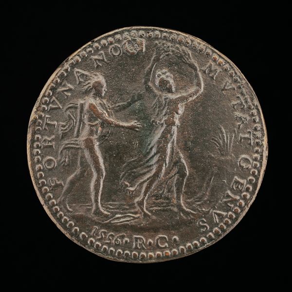 Curator: Oh, this has a lovely, warm feeling. Almost sepia-toned, like looking back through time. Editor: We're looking at "The Church of Santa Lucia at Grottammare [reverse]" by Domenico Poggini, dating back to 1590. It's a bronze relief, specifically a medal. Curator: A medal! It looks monumental, like it should be on a building! But held in your hand, that shifts the entire narrative, doesn't it? Suddenly it's portable power, a pocket-sized declaration of faith. Editor: Precisely. Think of the context – the late Renaissance, a period grappling with religious reformations and counter-reformations. A medal like this, depicting the Church of Santa Lucia, could function as both a symbol of civic pride for Grottammare, and as an assertion of Catholic identity. Curator: I love the detail. Even at this scale, you can see the individual columns, the little details above the doorway… it’s such a clear statement. It must have taken the engraver great skills. What's fascinating is the "reverse." What was on the other side? Editor: Usually, a portrait of a ruler, a patron, or even a saint. The pairing of that figure with the architectural rendering of the church on this side invites a deeper meditation on power, patronage, and religious authority. The medal operates almost like a portable monument. Curator: I wonder, who carried it? What hands held this piece of bronze, passing on faith like a tangible inheritance? I bet they never imagined we would examine it in a glass vitrine. Or worse... melt it down for bullets! Editor: Right, and we can think about the concept of reverse. This could mean the other side, yes, but more significantly, that Poggini presents a space of possibilities: perhaps an individual’s potential to see the institution, the Church, differently through his own vision. What new meanings could they give to it? Curator: Hmmm, fascinating. I come back to its feeling – of solidity and permanence, even as a small token. What an amazing time capsule in bronze. Editor: Indeed. And by understanding these artifacts, we can unearth so much about the world they were part of and about the very nature of belief itself.