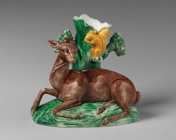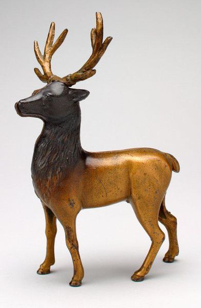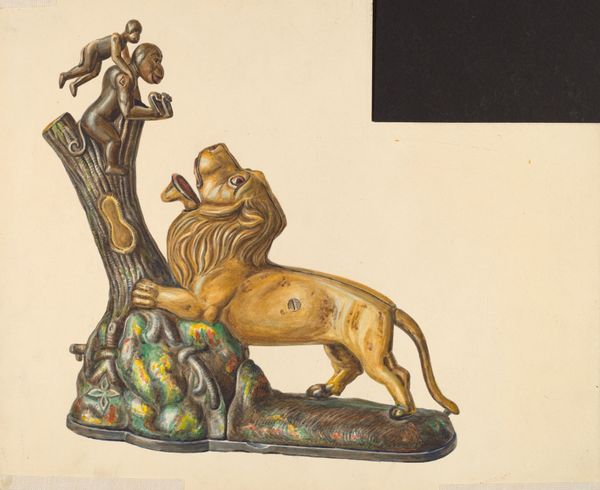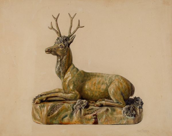 Editor: Here we have "Stag Statuette," a watercolor and drawing from sometime between 1935 and 1942 by Cleo Lovett. I'm really struck by its stillness, it has an almost photographic quality. What stands out to you when you look at this work? Curator: Well, immediately, I see the interplay between representation and material reality. The artist chose watercolor, a medium traditionally associated with delicacy, to depict what appears to be a mass-produced, possibly ceramic, object. Editor: Interesting! I hadn't considered the medium itself so much. Curator: Consider the social context too. The date suggests the Depression era. Was Lovett commenting on mass-produced objects becoming stand-ins for handcrafted ones, during an economic hardship? Was this statuette, easily replicated, accessible to people who couldn’t afford the materials of the fine arts, like bronze? Editor: I see your point. The painting then becomes not just an image of a stag, but also a reflection on consumerism and class, perhaps? Curator: Exactly. And consider the artist’s labor in meticulously rendering this object in watercolor, elevating its status, while simultaneously questioning the hierarchy of art and craft. Are they critiquing the culture of materialism or engaging with it? Editor: So you're saying the very act of choosing to paint this particular subject matter with watercolor imbues the work with layers of meaning related to production and social value. It’s like, the painting becomes an argument in itself! Curator: Precisely. Art doesn't exist in a vacuum. It’s produced by someone, with specific materials, under particular conditions. By examining those elements, we can unlock deeper interpretations. Editor: That's a fascinating perspective, it’s broadened my understanding of the piece immensely! Curator: And that's what makes art history so exciting, isn’t it? We peel back the layers, one brushstroke, one firing, one social condition at a time.