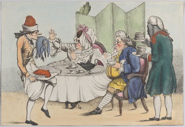 Thomas Rowlandson made this print, "Two Strings to Your Bow," using etching and hand coloring techniques. It was a labor-intensive process, involving acid-biting a metal plate to create the image, then inking and printing, and finally applying colors by hand. This printmaking method was perfect for satire because it allowed Rowlandson to create multiple copies, making his social commentary widely accessible. The hand-coloring aspect suggests a workshop setting, with artisans carefully applying washes of pigment according to Rowlandson's instructions. Consider the irony: commenting on the excesses of the wealthy through a process that itself involved considerable hand labor. Rowlandson blurs the lines between production and critique, showing us that even the tools and techniques we use carry their own social weight. It challenges us to think about how art can be both a product of its time and a commentary on it.