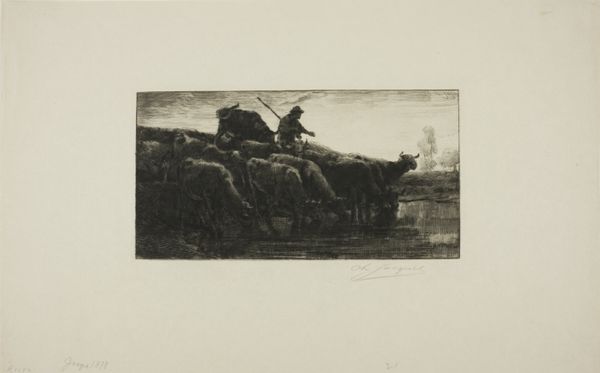 Curator: Looking at this work by Charles Jacque from 1864, called "The Morning," one immediately appreciates the intricate detail captured in this etching and print. It really draws you in. Editor: It does. It's a very somber scene; the monochromatic palette contributes to this feeling of muted labor, perhaps a bleak portrayal of rural life? Curator: Perhaps, but I see something more timeless in the representation of toil. The hunched figure on horseback evokes archetypes of the rural worker. Consider the symbol of the horse itself: throughout centuries, it has been the companion animal of farming communities. Editor: That reading strikes me as romanticized. These agricultural laborers were often working under oppressive social systems. I see exhaustion here, not timelessness, which certainly complicates the reading. Curator: But look at the precision of line, the way the artist captures the light of dawn breaking across the landscape. Does that luminosity not hold promise? Even hope? Editor: Hope perhaps for whom? Is it not the landed gentry who benefited from scenes such as these, and who often commissioned such works, not the other way around? Curator: Regardless of who the work may have been intended for, its artistic merit endures. Its appeal comes from the universal imagery that exists within; this visual record reminds us how connected we are, not only to this genre of pastoral scene, but to a sense of humanity which continues to reside, unchanged, throughout generations. Editor: I do recognize the technical skill at play, how it does create an image which could resonate widely, though not always with progressive meaning for its viewers across time. It's a window into the world that reflects back how differently people inhabit space, work, and perceive beauty depending on their positions and backgrounds. Curator: Indeed. Art allows us to confront perspectives. A scene may evoke very different memories and understanding for both the viewer, and also across multiple readings of the same symbols which were so familiar for the generations that created it. Editor: Absolutely. Considering these divergent perspectives hopefully broadens the historical narrative surrounding rural life and genre paintings, prompting reflection on historical and social contexts.