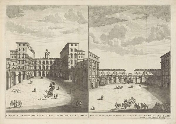 Editor: Here we have Domenico Montaigú's "Piazza del Quirinale," an engraving from sometime between 1750 and 1799. It feels like a stage, doesn’t it? Grand buildings flank a vast, almost empty space populated by tiny figures. What strikes you about this piece? Curator: What I find compelling is the representation of power through urban planning. Consider how this vast, open space—the piazza—functions. It's not just an aesthetic choice. Editor: So, the emptiness isn’t really emptiness? Curator: Precisely. Think about Baroque Rome, heavily influenced by the papacy. These wide piazzas weren’t merely decorative; they were designed to impress, to control crowds, to facilitate processions and displays of papal authority. Can you imagine the impact of seeing a religious parade marching through here? Editor: Ah, so the space itself becomes a tool. I guess it puts the viewer in a specific place too, making them feel maybe small, but also connected to the grandeur of Rome. Curator: Exactly. And consider the role of engravings like this one. They weren't just art; they were a form of documentation, of propaganda even, showcasing the achievements and aspirations of the Church and Roman nobility to a wider audience. Disseminated widely, images such as these visually cemented papal claims of power throughout Europe. How do you see the act of 'sight-seeing' being influenced? Editor: I never really thought about it, I’m looking through someone else's eyes here, and their focus is on displaying the government. These architectural statements must have had political repercussions on other cityscapes in Europe too, creating these images to present to their own audiences, right? Curator: Absolutely, you’ve hit on a very significant point. The circulation of imagery of architectural designs and urban space facilitated how states demonstrated soft power through the adoption of new tastes across society. Editor: This makes me appreciate the layered meanings that go beyond its simple aesthetic, thank you! Curator: Indeed, the ‘empty’ space speaks volumes about power, representation, and the projection of authority through art.