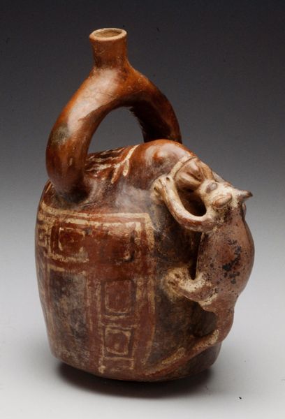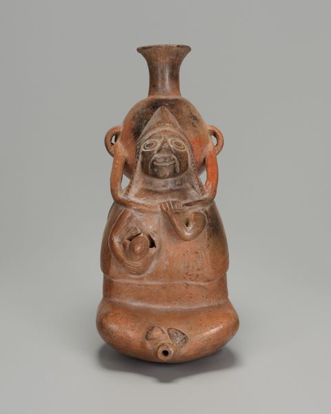 Editor: This ceramic "Handle Spout Vessel Depicting an Erotic Scene" by the Moche culture, circa 100 to 500 CE, is quite striking! It's more explicit than I anticipated, almost playful in its depiction. How should we interpret it? Curator: Focusing on its materiality, this vessel moves beyond mere representation to function as a significant cultural artifact. Ceramic production, firing techniques, and the vessel's intended use all reflect specific Moche social structures and belief systems. What do you notice about the surface and the detail of the figures? Editor: The surface is smooth and polished, suggesting careful craftsmanship. The figures, despite being small, are quite detailed, especially considering the medium is just clay. It's more elaborate than simple utilitarian ware. Curator: Exactly. The labour invested signifies the importance of the subject matter. Erotic depictions like this, rendered in such a permanent and accessible material, were likely integral to Moche rituals and societal norms. How does considering its widespread potential "consumption" change your understanding? Editor: It suggests a more public and perhaps less purely functional role than just storage. This vessel then could become a carrier of encoded cultural values and communal expression rather than individual erotic experience. The clay becomes a tool in crafting and conveying ideologies! Curator: Precisely! The vessel blurs lines of high art, craft, and labor, and considering those informs a rich understanding of this complex culture, and reminds us that "fine art" wasn't a concept uniformly applied in the ancient world. Editor: This discussion's altered how I see not only this vessel but really any art object. Paying attention to its raw form, its construction and intention makes you feel a more grounded relationship to the piece and culture, thank you!