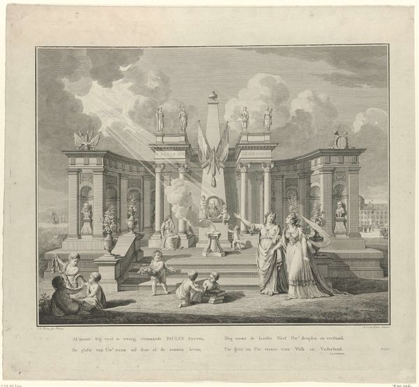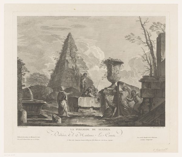 Curator: This engraving by Pierre François Tardieu, created between 1754 and 1771, is titled "Ruins in the Peloponnese with Figures". It offers a glimpse into how 18th-century artists viewed and interpreted classical antiquity. Editor: There's a melancholy beauty here, like stumbling upon forgotten greatness. The detail is incredible – you can almost hear the wind whispering through those crumbling columns. The figures seem small and almost theatrical amid such colossal wreckage. Curator: Absolutely. The image is rich with symbolism reflecting the Neoclassical movement’s obsession with the perceived virtues and lessons of antiquity, the figures a romantic rumination of ancient civilization set amidst idealized ruins. Editor: Ideals always come crashing down, don't they? The broken pieces make me think of lost empires and fading memories. There’s something almost existential in that lone figure reaching up, like asking why the heavens allow it. Curator: Precisely. The location depicted, the Peloponnese, held great historical significance as the site of Mycenae and Sparta. This was, in a sense, a visual elegy for the cradle of Western civilization, prompting the viewer to reflect on time, change, and the transient nature of power. Editor: The light really sets a contemplative mood too, doesn’t it? A soft, filtered light like memory itself, with all the sharp edges worn smooth, like the very ruins it depicts. Curator: We must consider that engravings such as these served not only as artistic expressions but also as important vehicles for disseminating knowledge about classical sites to a broader audience that was unable to travel and study them directly. This artwork is thus equally artifact as well as document. Editor: It's strange to think something broken can create something so lovely, or remind us so profoundly of what matters. I get a similar feeling from looking at abstract expressionism... Curator: Well said, very insightful indeed. Editor: Indeed! Let’s wander into the next room!