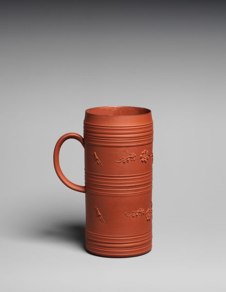 Curator: This is a Black Basalt milk jug, crafted by Neale & Palmer between 1790 and 1825. Editor: The subdued tone evokes a sense of classical austerity. Almost funereal, in a way, yet with an undeniable elegance. Curator: Black Basalt ware was developed as a cheaper alternative to porcelain, very popular because it mirrored the shapes and styles of luxury silverware. The pursuit of affordability through ceramic, a democratization of form. Editor: It's intriguing how the black colour affects its visual language. The imagery along the top—perhaps stylized foliage?—it becomes spectral, hinting at secret or lost meanings. Does it call back to a particular classical myth, or conjure images of pastoral life? Curator: Likely classical. It was a time of revivals, and this speaks to broader economic shifts where Wedgwood successfully manufactured ‘ancient’ forms, exploiting and creating consumer markets. Mass production met aristocratic desire. Editor: You’re right; it lacks a certain… handcrafted charm. The pursuit of precision leaves it somewhat cold, doesn’t it? Yet the black enhances the symbolism of rebirth or resilience perhaps, since basalt forms from volcanic fire? Curator: Perhaps the floral ornamentation gives a nod to the domestic sphere—balancing production, labour, and service. The industrializing world impacting both the higher and lower reaches of the classes through product availability. Editor: Considering this object, the play of light against the matte surface, combined with those somewhat obscured figures...it’s not simply a milk jug. The jug stands as a meditation on the human relationship to nature. Curator: Precisely! To see something everyday in the production, is how we find an unexpected depth when examining labor, material, form and historical context. Editor: Agreed, there's something potent about observing the mundane and unlocking latent significances, especially regarding culture and history. Curator: It adds nuance to its simplicity, as we trace its role from kiln to table, manufacturer to owner.