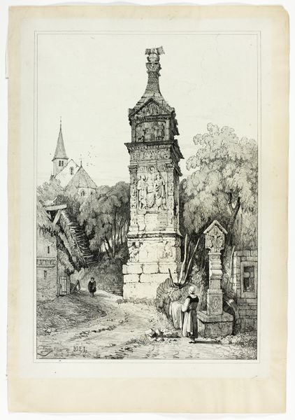 Curator: Looking at this artwork, "Andernach," crafted by Samuel Prout around 1833, I’m immediately struck by its delicate yet commanding presence. The technique involves printmaking methods like lithography and etching on paper, all working together. What is your first impression? Editor: It feels melancholy, almost a gothic ruin in miniature. The light is stark, and there's a wonderful density in the way the textures of stone and water are captured. Curator: Prout, you see, was deeply invested in the processes of capturing architectural forms through prints; the lines, tones, and compositions, were all mediated by both the printing press and the socio-economic context of print production in early 19th century Europe. Prints were an industry! Editor: Agreed. But I see an acute study in contrasts. The massive, ornamented tower dominates the composition against the humble bridge and diminutive human figures; even the crisp lines and cross-hatching against the relative flatness of the sky. Curator: True, the print technique would definitely allow Prout to amplify the sublime qualities inherent in architecture viewed by everyday folk. Prout really sought out such crumbling remnants in the landscape, almost as if they themselves were resisting the forces of industry bearing down upon Europe at the time. Editor: These aren’t simply picturesque, idealized landscapes. They’re documents, visual records meant for mass consumption – a way of knowing, controlling, even owning the experience of the natural world via image production. And let's consider that dominant vertical—that looming tower and church—are really working as visual anchors. Curator: What fascinates me most is how Prout combined etching and lithography, two methods reliant on chemistry and mechanical means that allowed for nuances of shading and subtle textural variation... he's not just showing the thing, but investigating the how of representation through reproduction! Editor: I think that in "Andernach," Prout has given us not just a place, but a poignant moment captured in time. The structural elements all coalesce into a haunting image. Curator: Precisely; it encourages us to delve beyond mere appearance to unearth the layers of creation behind such views and their value. Editor: An investigation in art, culture, commerce, and a dash of the sublime indeed!