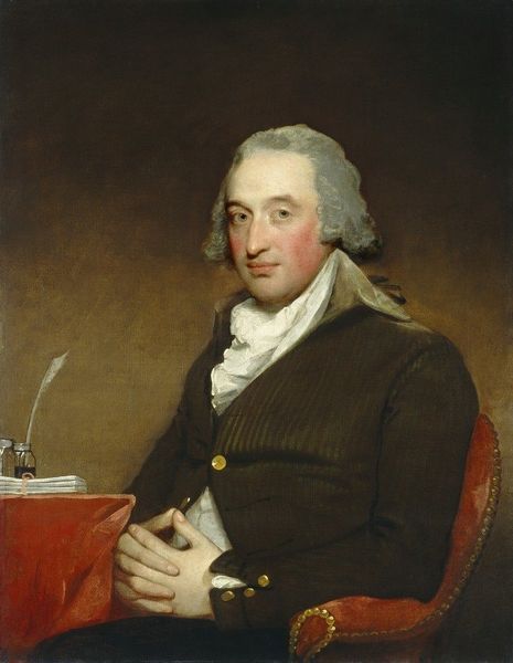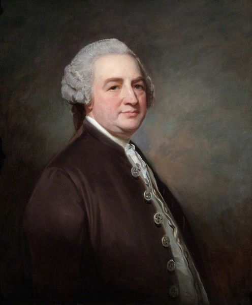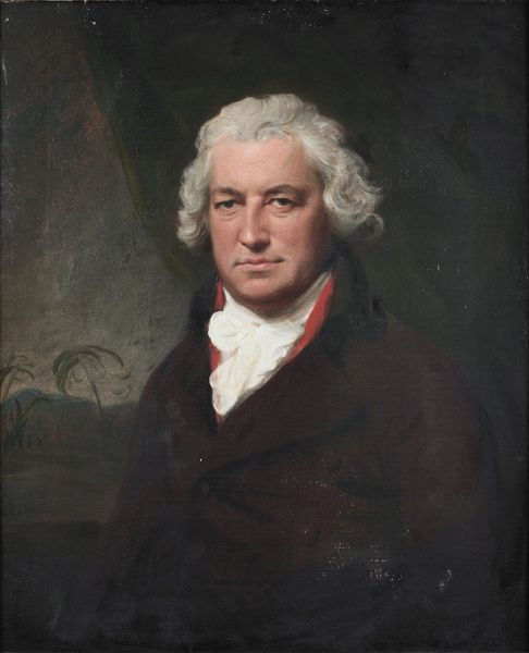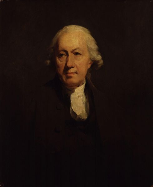 Curator: Here we have Lemuel Francis Abbott's "Portrait of Thomas Pasley," painted around 1796. Quite striking, wouldn’t you say? Editor: My immediate feeling is one of, dare I say, understated authority. There’s a palpable gravitas about him. He commands respect without needing to shout. Curator: Abbott really captures the essence of a naval officer, doesn’t he? Notice how the light catches the gold embellishments on his coat, directing your eye. It’s a masterclass in compositional control. Editor: Absolutely, the texture of the coat is amazing; such dark hues seem fitting given Pasley's occupation. And yet, there's an undeniable melancholy about his expression. Those subtle lines around his eyes hint at stories untold, battles fought. Does this portrait capture an essence of Romanticism you would suggest? Curator: It definitely aligns with Romantic ideals. Abbott's ability to infuse the portrait with feeling elevates it beyond a simple record of appearance. Pasley was seriously wounded in battle...it is easy to romanticise military conflict, so his somewhat careworn countenance reminds the viewer of its realities. There's this kind of heroic stoicism but tinged with a definite vulnerability. Editor: His ruffled cravat, rendered in these lovely opalescent hues, creates a sharp juxtaposition with the naval jacket, an exercise in formalism itself. It highlights this interesting tension between vulnerability and strength, if I may use your terms. Did Abbott aim for such tensions intentionally, using brush strokes almost as arguments? Curator: Hard to know for sure! Maybe his expression, the set of his jaw...It may give a slightly rosy tinge of the sort one would not doubt Romantic poetry about sailors might ascribe. Editor: You may well be right. Perhaps it captures something essential about Britain at the time: confident but weary. Curator: A potent reminder that even behind the most composed exterior lies a sea of experience. Editor: Exactly. And those stories deserve to be heard...or at least, seen.