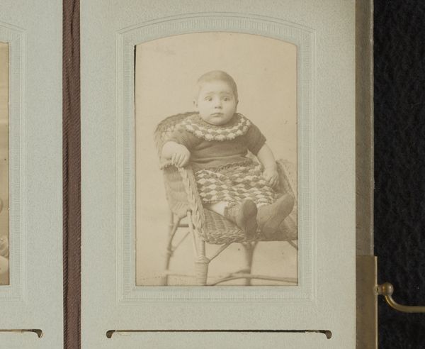 Editor: This photograph, entitled 'Portret van een zittende baby in witte jurk,' was created by Josephus Hendrikus Petrus Coppens between 1889 and 1925. It's a charmingly direct image of a baby. I find myself drawn to the contrast between the soft dress and the stiff backdrop. How do you interpret this work? Curator: Formally, the image relies heavily on contrasting textures. Notice how the photographer has juxtaposed the smooth, almost porcelain quality of the baby’s skin with the rough, geometric arrangement of what appears to be a palm frond supporting the subject. What does that juxtaposition evoke for you? Editor: That’s a good point. The backdrop is sharp, angular. Maybe it's emphasizing the innocence of the baby, juxtaposing softness and vulnerability with the sharp edges of the adult world. But doesn't the background also distract from the main subject? Curator: The background's geometric rigidity functions as a counterpoint, actually enhancing the roundness of the child's figure. Coppens has orchestrated a careful balance, not a distraction. The tonal range, largely monochromatic, also underscores the photograph's focus on form and texture, don't you agree? Editor: Absolutely. The limited tonal range definitely pushes us to consider the texture and form more. Thanks, I never would have analyzed it that way. Curator: It’s in recognizing these formal relationships that we can start to unlock meaning in any artwork. Keep exploring.