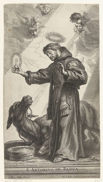 Editor: This is "H. Franciscus van Assisi," an engraving by Cornelis Galle I, created sometime between 1586 and 1650. The detail in the rendering of fabric and skin is astonishing, but there's a certain...grimness to it, isn't there? The skull next to the book... What strikes you most about this print? Curator: The "grimness," as you call it, stems from a very deliberate use of materials to convey the stark realities of human existence, filtered through a religious lens. Look at the linear quality achieved via engraving: this is not painting aiming at naturalism, but an artisanal mode. How does Galle leverage the material properties of engraving to propagate the ideologies of poverty and devotion? Editor: That's fascinating – how the medium itself reinforces the message. So, the choice of engraving over, say, painting, emphasizes the labor and process...and therefore the virtue of hard work? Curator: Precisely. And consider the role of prints at this time – a relatively affordable method of disseminating imagery, making this representation of Saint Francis and his message accessible. Think about how Galle skillfully uses the engraving technique – the precise lines and controlled shading – to underscore a message celebrating simplicity and religious devotion. How is consumption and access at play in shaping Baroque audiences? Editor: I see. So, the material production of this work directly ties into its social function – making religious iconography accessible and promoting specific values. Curator: Exactly. The interplay between materials, production, and the message it communicates creates a multi-layered meaning that is rooted in the culture of that period. Understanding the process offers an interesting view into the social role this imagery served. Editor: That's given me so much to consider about how artists of this period were involved with material choices. I'm left seeing engraving and Baroque in a completely different light!