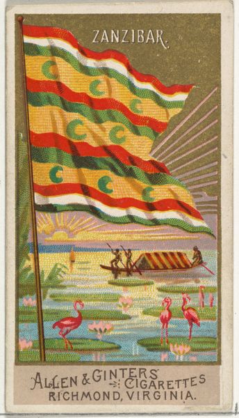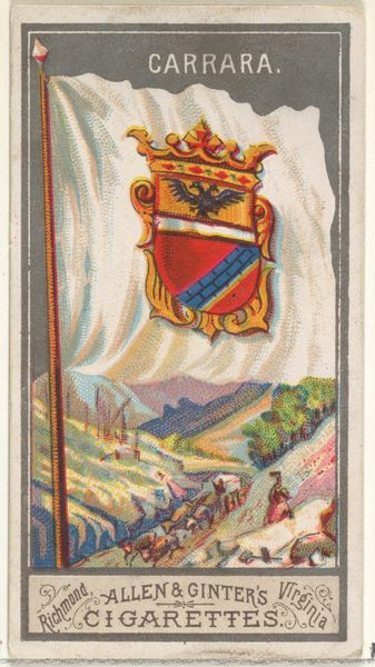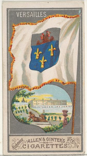 Editor: This is a print from 1887, “Amiens, from the City Flags series (N6) for Allen & Ginter Cigarettes Brands.” I'm struck by how it combines heraldry with a sort of idealized landscape view. What connections do you see between the images and the historical context in which it was created? Curator: Well, considering this was a promotional item for cigarettes, it immediately raises questions about the political economy of taste and desire. How is a city like Amiens, likely unfamiliar to many consumers, being used to elevate the perceived value of tobacco? Editor: So, you think it’s about imbuing the cigarettes with a sense of European sophistication? Curator: Precisely. The flags represent established power, evoking ideas of history, prestige, and perhaps even empire. Meanwhile, consider the cityscapes included; they present carefully constructed visions. Who benefits from this idealized presentation? What realities are being obscured or actively ignored to perpetuate that image? Editor: That’s fascinating. It really wasn't something I thought about on first viewing, but now I wonder if it's meant to distract from the darker realities of labor practices connected with the tobacco industry? Curator: Exactly. And we might also reflect on the cultural politics inherent in distributing these images so widely. This distribution through consumer culture serves a powerful, even if subtle, form of cultural and political persuasion. Editor: I see, it is a piece that really demands we look at art, commerce, and history altogether. Thanks for making me think deeper. Curator: Indeed. Examining these visual traces, helps us decode the persuasive messages embedded in everyday objects.