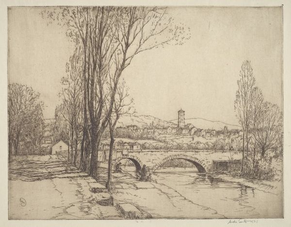 Curator: Today, we’re looking at James McBey's etching, "Bridge of San Martin, Toledo," created in 1911. It has a stark quality; what are your first impressions? Editor: The mood it evokes is certainly brooding, with those stark lines hinting at something foreboding lurking beneath the surface. All those dark and contrasting lines converge at the top, creating an arch to me. I imagine this bridge speaks to strength and power over a passage or time itself. Curator: Interesting observation. If you examine the formal arrangement of lines and shapes, McBey has masterfully used the etching technique to create depth. The repetition of the archways of the bridge forms a visual rhythm that carries the viewer’s eye across the landscape. Editor: Indeed, the bridge itself acts as a potent symbol here. Bridges in art are often viewed as liminal spaces - threshold between two worlds, past and future, conscious and unconscious. And positioned in Toledo, known historically for its religious coexistence and conflict, makes this artwork ripe for deeper reading. Curator: It also exemplifies a remarkable interplay between light and shadow. The reflected water seems to mirror a sense of unrest—the jagged lines amplify rather than subdue the architectural construction. Editor: The light striking the bridge is compelling and reinforces the iconographic interpretation of my view, Toledo was considered as ‘city of the three cultures’ during medieval times. In the print, the harsh lights seems almost judgemental – not harmonious as that notion suggests, which evokes a more layered complexity. Curator: Your point underscores how historical and symbolic context shapes our understanding. But purely in formal terms, the dynamism he has produced in a confined space stands out as it's a landscape almost devoid of movement, but with so many visual elements going on. Editor: Yes, indeed, which invites viewers to construct their narratives to unpack history or a feeling embedded in this artwork through what they know and what is visually apparent, wouldn’t you agree? Curator: Definitely. Thank you, both for exploring McBey's technique and this evocative interpretation of his work today! Editor: A thought provoking piece for sure. I am certainly going to do some further research.