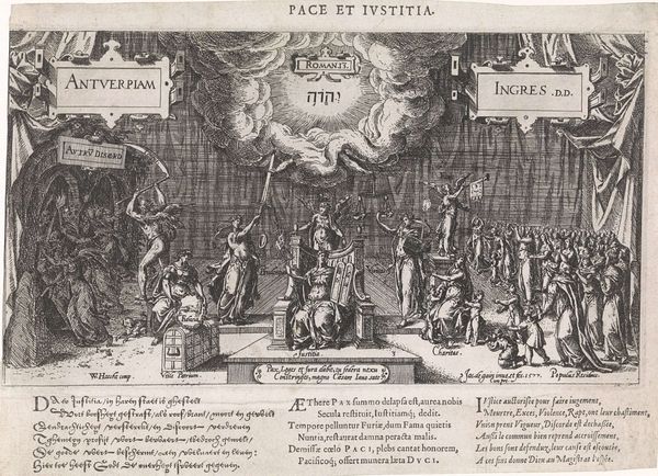 Curator: This is Jacques de Gheyn the Elder’s "The Expulsion of Tyranny," an engraving from 1577. Editor: It’s incredibly detailed; the sheer volume of figures creates a swirling sense of…exuberance, perhaps? A chaotic dance away from darkness. Curator: That chaotic energy stems from the Baroque style and the dense linework. De Gheyn uses line to define forms, creating a textured surface. It also communicates a lot about its cultural milieu: consider the themes present in it such as history-painting, figuration, and allegory. The scene bursts with symbolism relating to the revolt against Spanish rule in the Netherlands. Editor: Precisely. The print showcases a dynamic narrative: Tyranny, driven from its throne, while virtues like Justice and Peace flourish. Note the inscriptions that complement the visual narrative, written in Latin, French, and Dutch, probably reflecting the linguistic landscape of the region at the time. Also, there is a very interesting visual break happening with a heavenly scene juxtaposed against more earthly figures in what appear to be dynamic revolt. It almost reads like a before and after image combined. Curator: Indeed. The central scene depicting Justice and Prudence joining hands emphasizes the restoration of order and wise governance. Then on the right, the figures represent civic virtues. These are not merely aesthetic choices, but carefully constructed representations of moral and political ideals. Even the architecture contributes, framing these allegorical representations. Editor: Viewing it through a modern lens, this print echoes calls for liberation we hear even now. The fight against tyranny and the aspiration for peace remain incredibly potent, timeless desires that people all over the world hold dear. Curator: Absolutely. De Gheyn offers us not only a visual document of a historical moment but a timeless allegory of resistance and hope. Editor: It leaves one to ponder the ongoing cycle of oppression and liberation, and the enduring power of art to mirror, critique, and inspire change.