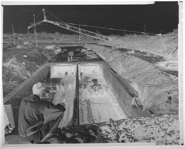 Editor: Here we have an untitled photograph, likely from the mid-20th century, by Lucian and Mary Brown, showing two children playing in a sandbox. It's quite a simple, almost mundane scene, but something about the light and shadow feels very dreamlike. What catches your eye in this image? Curator: Oh, absolutely! It's the everyday elevated, isn't it? I see the innocence of childhood, of course, but also a real attention to form. Notice how the inverted tones almost flatten the space. The light transforms the gritty sand into something otherworldly. Do you think the artists intended to capture a fleeting moment, or something more enduring about childhood? Editor: I'm not sure, but I appreciate how you pointed out the flattening effect. It makes the scene feel both intimate and distant at the same time. Curator: Exactly! It’s this tension between the familiar and the strange that makes the image so compelling, isn't it? Makes you wonder about their day, doesn't it?