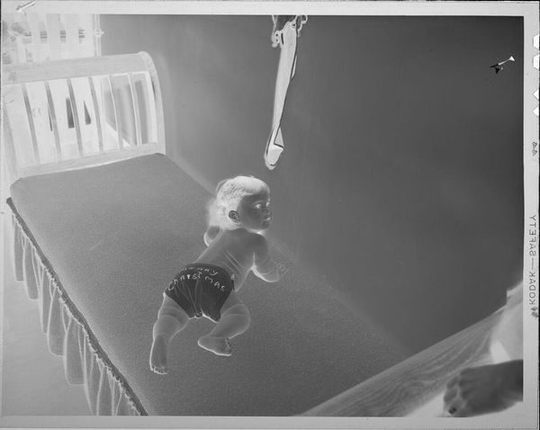 Curator: Here we have an intriguing, undated photograph titled "Untitled (woman giving bath to baby)," credited to Lucian and Mary Brown, currently held at the Harvard Art Museums. Editor: It's haunting. The high contrast and shallow depth of field draw me to the baby’s stark, unwavering gaze. Curator: The domestic scene contrasts sharply with the unsettling aesthetic. The photographic manipulation might reflect anxieties around motherhood in a changing social landscape. Editor: Yes, and the doll itself, rendered so starkly, takes on the archetypal symbolism of vulnerability but also a kind of uncanny knowing. It echoes anxieties found in the gothic. Curator: The Browns' collaborative approach likely informed its unique visual tension, reflecting both personal and societal perspectives. Editor: Precisely. It's fascinating how a seemingly simple domestic moment can be infused with such potent symbolic weight.