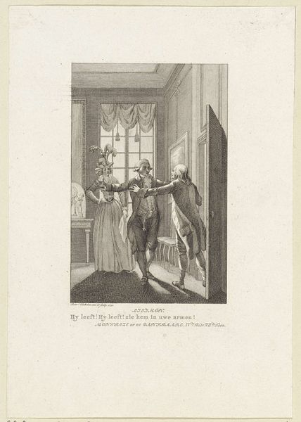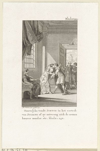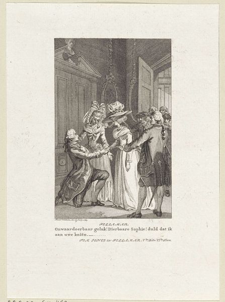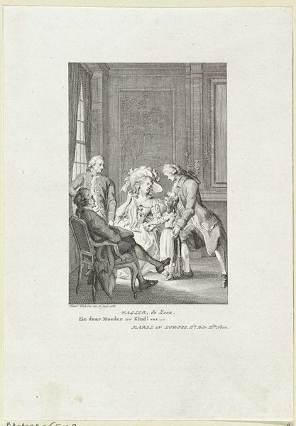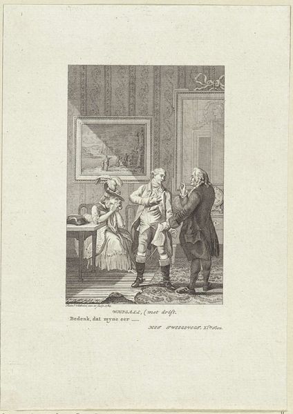 Editor: This engraving, “Arme oude man in gesprek met een rijke heer” – or "Poor old man talking to a rich man" – by Reinier Vinkeles, dates from 1775. It's intriguing, but I’m drawn to the contrasting spaces within the image, the stark outdoor light versus the ornamented interior. What do you see in this work, from your perspective? Curator: The linear precision achieved in this engraving commands attention. Notice how Vinkeles articulates spatial depth, not through dramatic tonal shifts, but through subtle variations in line weight and density. Do you observe how the architectural setting, with its meticulously rendered details, serves as a stage for this human interaction? Editor: Yes, the geometry of the room is fascinating. But the figures feel a little stiff; are they meant to represent types rather than individuals? Curator: Perhaps. Consider the formal arrangement: the contrast in attire, posture, and the directional gaze contribute to the narrative. Semiotically, each element operates as a signifier. The composition underscores a particular social dynamic that the artist tries to expose. Do you agree? Editor: I can see that, the artist invites us to read into social tensions through his use of form and structure. Still, I find it hard to look past the characters. Curator: The true focus lies in the intrinsic pictorial language itself. The artist creates a fascinating semiotic field which encourages us to question pre-existing notions about structure. Editor: Thanks, I appreciate how you break it down and show the importance of formal qualities in it. Curator: Precisely. It is the interplay of these formal elements which conveys the message most eloquently.