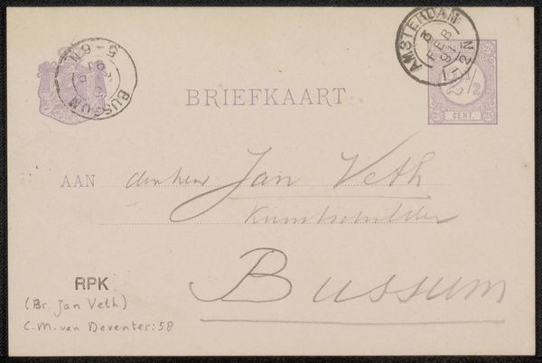 Editor: This is "Briefkaart aan Philip Zilcken," a pen drawing on paper by Willem de Zwart, created before 1899. It's literally a postcard. I find it interesting for its lack of traditional artistic imagery. What’s there to appreciate beyond its historical function? Curator: It’s fascinating how mundane objects become imbued with significance over time. This postcard, seemingly simple, acts as a visual echo of a bygone era, holding multiple layers of coded meaning for the sender and receiver, perhaps even unconsciously. The postal stamps, the stylized handwriting – what do they evoke for you? Editor: Well, the stamps and the handwriting make it feel very personal and intimate, as if I'm glimpsing a private moment in the past. But I'm unsure how to go beyond this. Curator: Consider the very act of sending a postcard in that era. Before telephones were ubiquitous, this was a primary means of quick communication. What symbols of connection and distance might be at play here? What's conveyed by handwriting versus print? Look closely. The address itself: "Kunty Ohil den, Begijnderkout," and then "Den Haag" underneath, does it suggest anything to you? Is there anything familiar there? Editor: Ah, it feels local and quaint – names, stamps and the Dutch words evoke a strong sense of place. I suppose that place *is* the main image here. I guess a postcard, an image you send to someone, almost represents your culture, writ small. Curator: Precisely. The choice of script, the style of the address – all point to a specific cultural and social context, speaking volumes about the relationship between the sender and the receiver. Even the stamps – government-sanctioned images - become signifiers of national identity and civic life. This little scrap of paper is full of meaning, isn't it? Editor: Yes, it is! I had never considered how much information is conveyed through something so commonplace. It shows that the act of communication itself, its symbols and materiality, can become an art form.