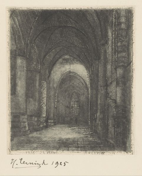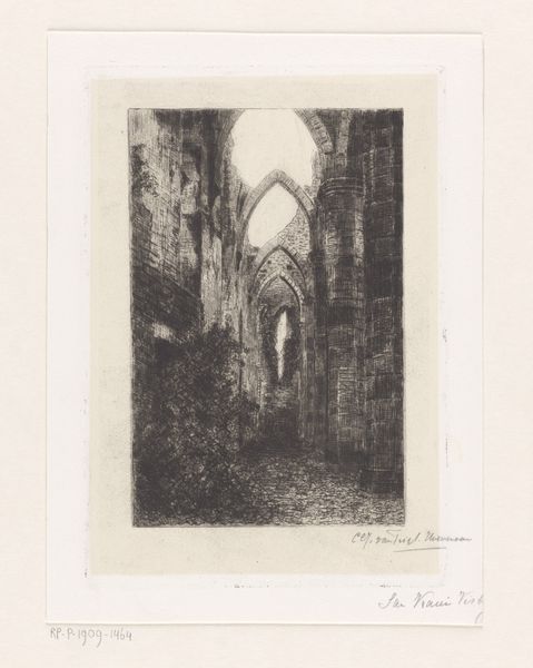 Cornelia Christina Johanna van Trigt-Hoevenaar created this work, "Ruïne van San Karin op Visby," using pen and brush in gray ink. The somber tones and architectural elements evoke a sense of melancholy and the passage of time. Notice how the composition is structured around a series of pointed arches that recede into the distance. The arches, rendered with meticulous detail, create a strong sense of depth, pulling the viewer's eye through the ruins. The crumbling stonework and overgrown foliage are rendered with a texture that emphasizes the organic decay contrasting with the building's geometry. The play of light and shadow across the ruins is also crucial. It both reveals and conceals, adding to the overall mood of mystery. The ruins, once a symbol of strength, are now in a state of entropy. This contrast challenges our notions of permanence, inviting contemplation about time's relentless and transformative effects. Ultimately, it is the formal qualities – the lines, textures, and tonal contrasts – that work together to create a powerful and reflective visual experience.