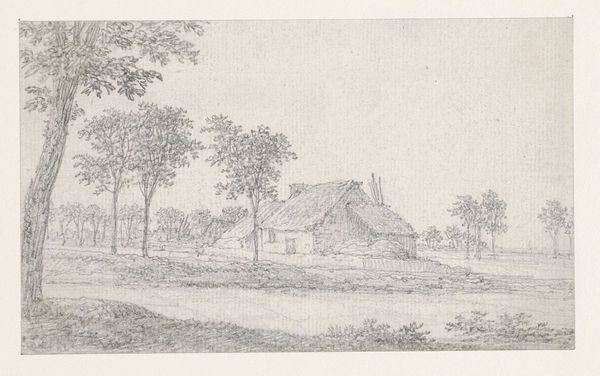 Egbert van Drielst created this drawing, "Farms near Beilen in Drenthe," with pen in gray and brush in gray, sometime in the late 18th or early 19th century. Observe how the somber palette and the composition, dominated by horizontal lines, evoke a sense of quietude. The architecture and landscape in the drawing suggest that the artwork is more than just a depiction of rural life. The thatched roofs, rendered with meticulous detail, speak to a deeper interest in the material culture of the Dutch countryside. A semiotic analysis reveals how the artist employs visual codes to construct a commentary on the relationship between humanity and nature. Note how the artist destabilizes the traditional landscape genre by focusing not on the sublime or picturesque, but on the mundane aspects of everyday existence. This choice reflects a broader shift in artistic and philosophical concerns, challenging established values and exploring new ways of thinking about space and representation.