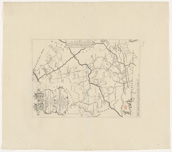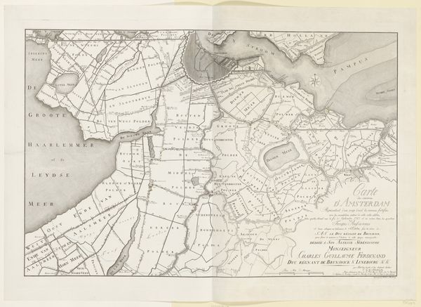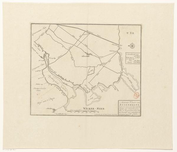 Curator: The drawing before us, "Kaart van het IJ, 1674 (linkerdeel)," or "Map of the IJ, 1674 (left part)," rendered in ink and etching, gives us a bird's-eye perspective of a crucial waterway in the Netherlands. Editor: Immediately striking is its austere geometry. It's less a romantic landscape, more a precisely rendered framework for understanding the region’s geography. The subdued ink adds to its formal nature. Curator: Maps of this period served not only to represent space, but to wield power. Cartography in the 17th century was intricately tied to trade, military strategy, and the establishment of territories. Creating and possessing such a map implied authority and control over that space. Editor: The crisscrossing lines seem almost ritualistic, less about simple distance and more about laying claim. The names carefully inscribed evoke ownership, a sort of visual incantation over the land and water. Does it speak to Dutch mercantile prowess? Curator: Absolutely. The IJ was, and is, vital to Amsterdam's commercial success. This map, while seemingly objective, reinforced Amsterdam's dominant position and influence within maritime trade routes. Think of the Dutch East India Company's expansion during this era. These precise charts facilitated that expansion, documenting navigable waters. Editor: Those lines create a powerful, psychological link to the territory itself. Consider how lines form enclosures and divisions, and dictate the direction of our eyes and thought. This austere map does more than give data; it establishes the very limits of a cultural perspective. Curator: And even this section, the "left part," signals a grander project. We aren't seeing a simple view; rather a section of something larger, alluding to further reach. It indicates ambition, hinting at continuous expansion of the frame of authority. Editor: This "Kaart" is a fascinating symbol then: less a straightforward tool for sailors, more an emblem of the projection of dominance. Looking closely has shown me a complex negotiation of landscape, power, and cultural self-image, encoded in sparse ink lines. Curator: Yes, by delving into the context and examining the map’s inherent symbolism, we move beyond simply noting its visual appearance to consider it as a critical component in constructing a historical narrative. A narrative deeply rooted in political and economic motivations.