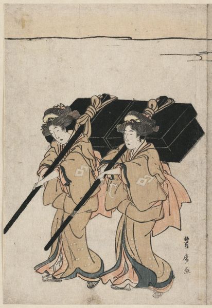 Curator: Here we have Utagawa Toyohiro's "Procession of Women Carrying Palanquin" from the Harvard Art Museums. Editor: It evokes a sense of quiet strength, doesn't it? The delicate lines and muted palette create a composed image, yet the subject suggests labor. Curator: Exactly. Toyohiro's woodblock print depicts women in a specific social stratum performing labor generally reserved for men, challenging traditional gender roles. The palanquin's presence speaks to hierarchies within their society. Editor: Note how the mountain in the background offers a subtle semiotic anchor, grounding the composition. Curator: Indeed, we see traditional Japanese aesthetic values at play alongside a subversion of social norms. Editor: It's a testament to how formal elements work together to amplify the narrative complexity. Curator: A compelling intersection of form and social critique. Editor: A fascinating contrast, yielding rich insight.