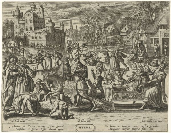 Curator: Welcome. Today we will be examining Willem de Haen's "Allegorie op het Bestand en de vereniging der partijen, 1609," created in 1609. The piece, currently held in the Rijksmuseum, is a meticulously crafted print employing engraving techniques. Editor: It's dense! There’s almost too much happening here, but my initial feeling is one of forced optimism. Despite the busy composition, the subdued tones create a somewhat muted celebratory atmosphere. Curator: Precisely. De Haen uses allegorical figures to represent the Twelve Years' Truce, a significant moment in Dutch history. We see figures like Justice, Peace, and Truth being drawn in a chariot, pulled by characters embodying the Dutch provinces. It speaks to unity and prosperity, key ideals of the time. Editor: But is it truly celebrating unity, or masking deep divisions? Notice how Mars is being pushed away, yet he's still present. This evokes a complicated question. Were there truly ever any intentions toward actual long-term conflict resolution between The Netherlands and Spain? What's happening on the battlefield behind, where lives seem actively still being claimed even in a scene of peace and reconciliation? Curator: Formally, we can observe a carefully constructed composition. The placement of figures, the linear perspective, and the detailed rendering of textures all contribute to a balanced, albeit complex, image. Semiotically, each figure carries a specific weight, creating layers of meaning intended to reinforce the political narrative. Editor: The placement of the portraits, specifically, speaks volumes. With portraits of Prince Mauritz, Albert, and Isabella around the main stage, each watches over the actions, embodying different perspectives, values, and goals, all ultimately tied together within their society. In its effort to represent unified peace and wealth for everyone, the absence of portraits representing more of the masses sends a clear message that a select few would stand to benefit more greatly from a cessation of war than all. Curator: It encapsulates a moment of cautious hope amidst ongoing tensions. De Haen masterfully translated a political agenda into a visually engaging print, showcasing a structured arrangement of historical figures, mythical personifications, and landscape details, all pointing toward a harmonious resolution. Editor: De Haen provides us with a valuable window into the construction of national identity and the political maneuvering of the time. His artwork doesn't just show peace; it performs peace, urging its viewers to actively partake in this new political reality while asking crucial questions around equity.