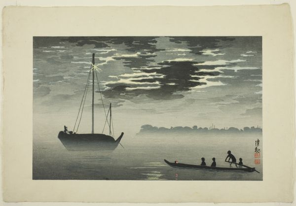 Curator: Prosper-Alphonse Isaac's woodblock print, "Twee roeiboten," roughly translated as "Two Rowboats," offers a somber and subtle view. Made sometime between 1868 and 1924, it immediately strikes one with its muted palette. Editor: Muted is the word. There's an almost melancholic stillness; you feel the dampness in the air and can almost hear the lapping of water against those boats. Curator: Indeed. Note the flatness, typical of ukiyo-e. Isaac plays with layering and subtle shifts in tone to suggest depth, the soft gradations create an atmosphere where forms subtly dissolve into each other. Look at the skyline's almost ghost-like appearance. Editor: I find myself drawn to the craftsmanship. Imagine the labor involved in carving those blocks to achieve such delicate detail, particularly in the reflections and the textural contrast between the water and the reeds. Who were the artisans, and what was their socio-economic status relative to someone like Isaac who might be more perceived as "the artist"? Curator: The checkered pattern on the boats also commands attention— a grid imposed on the organic shape. This interplay, however slight, hints at underlying structuralist tensions. Is it about nature versus human intervention? Or something more formal and abstract? Editor: Maybe it also has something to do with the lives of the individuals who worked on or used those boats. Were they fishermen, merchants? Each task implicating social relations and production. These materials offer only the final aesthetic gesture with no connection to their origin. Curator: Perhaps that is the allure, that emptiness allows infinite readings and projections, devoid of moralising narrative. I am particularly interested in the artist's control over tonal value as it shifts within a limited field of grey. Editor: And I am interested in what’s outside that frame, or perhaps what was silenced within. Both formally satisfying and rich in its production values this work still gives me more questions than answers.
