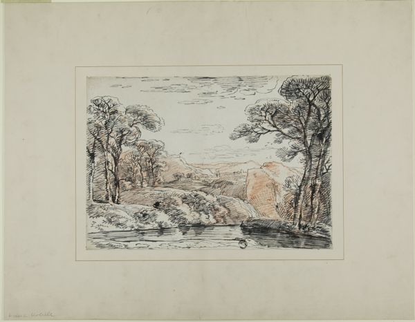 Joseph Mallord William Turner created this etching titled 'Crowhurst', plate 76 from Liber Studiorum. Notice the concentration of linear elements—the clustered, slender trees that command the composition's center. These vertical lines are echoed in the sparse vegetation and skeletal tree on the right, creating a rhythmic visual structure. This forest of lines contrasts with the horizontal repose of figures and fallen trees in the foreground, subtly destabilizing traditional landscape expectations. Turner uses line to define form and space but also to suggest movement and atmosphere. The sepia tones add warmth, yet the stark lines prevent sentimentality, pushing towards a more analytical viewing experience. The visual language here examines the relationship between humanity and nature, not as separate entities but as intertwined elements within a structured visual field. This invites contemplation on how we perceive and construct our understanding of the natural world.
