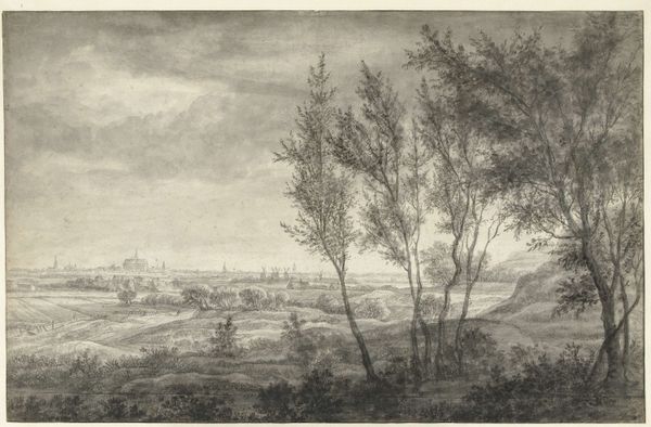 Editor: This small etching from the British School depicts a dark landscape with imposing clouds. It’s quite moody. What do you see in this piece that might tell us more about its historical context? Curator: This work is interesting in that it shows a romanticized view of nature. Consider how the British School used art to construct a national identity rooted in the natural landscape. Do you see how the drama of the sky amplifies this? Editor: Yes, the light seems to emphasize the vastness of the land. It almost feels staged in a way. Curator: Exactly. This is where art and politics intersect. How do representations of landscape contribute to ideas of ownership and national pride? Editor: That’s a really interesting point, thinking about how even landscapes can be political statements. Curator: Absolutely. Understanding this transforms how we view even seemingly simple landscape art.