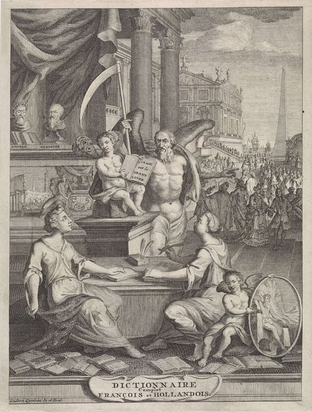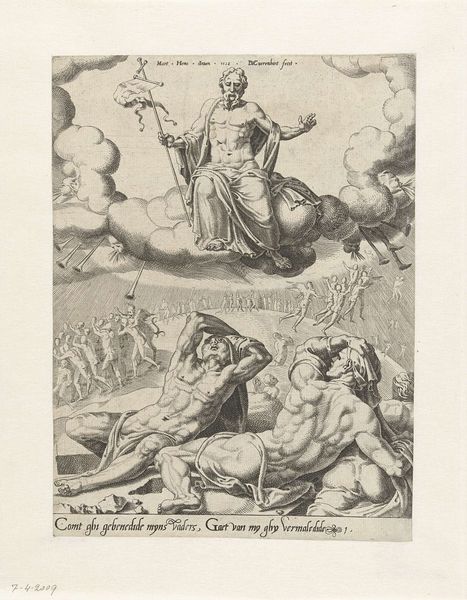Philippus Velijn created this print, "Jupiter before the birth of Minerva from his head," sometime before 1836, using etching techniques. Velijn lived through a period of significant political and social upheaval in Europe, including the Napoleonic Wars and the rise of nationalism. The artwork depicts a pivotal moment from classical mythology, where Jupiter experiences a severe headache, which leads to the miraculous birth of Minerva from his head. What does it mean to think about this image through the lens of gender and power? Jupiter, the dominant male figure, is in distress, and his body becomes the site of creation usually associated with the feminine. Minerva’s birth represents a disruption of traditional gender roles. The story reflects a patriarchal society's complex relationship with female power, where even a goddess's birth is mediated through male authority. The print invites us to consider the tensions between classical narratives and the evolving societal norms of Velijn's time, reflecting both the endurance and the reinterpretation of ancient myths.