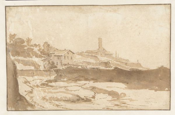 Editor: We’re looking at "Small Harbor Beneath Cliffs," an undated drawing by Claude-Joseph Vernet, rendered in ink, chalk, charcoal and pencil on paper. I’m immediately struck by the contrast between the lively activity near the shore and the imposing, almost stoic, cliffside. What do you see in this piece? Curator: The image sings with the symbols of transition and endurance. Water, a sign of fluidity and change, contrasts against the rigid, towering cliff, a monument to permanence. Look at how Vernet uses the tower atop the cliff, a man-made structure, juxtaposed with the natural rock formation. Notice its watchfulness and strength: it signifies the enduring presence of civilization facing the unyielding power of nature. The figures clustered by the harbor, are they starting a journey, or returning? Editor: I hadn’t considered the tension between man and nature so explicitly, or the sense of journey and return. Curator: Think of the harbor itself: it’s a liminal space, a threshold. Harbors throughout time have always been zones of transfer and exchange, of arrivals and departures. Consider too that groupings of people often speak to community, relationships that give strength to overcome adversity, which is represented here by the scale and density of the geological formations and dark sky. Do you see, now, the emotional weight the landscape form can carry? Editor: That makes the drawing feel more profound – less like just a pretty scene, and more like a contemplation on life’s journey. I’ll never look at harbors quite the same way again! Curator: Indeed! Symbols reveal themselves if you grant them time, memory and context. They reflect universal human experiences. What an artist chooses to include, what to exclude – this all tells a story, and creates a conversation.