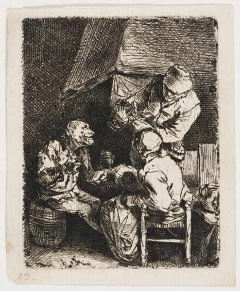 Editor: This is "Three Peasants by a Fireplace," an etching by Cornelis Bega, whose dates are unknown. The figures are very expressive, especially the seated peasant, who appears to be grinning and enjoying a tale. What do you see in this piece? Curator: I see the enduring symbol of community and storytelling around a hearth. Notice how the fire is implied, not explicitly shown, yet it's the focal point, the origin of the light, the center of their shared experience. Light equals insight. Shadow conceals. Editor: That’s interesting. The figures look a bit grotesque. Does that have symbolic meaning, too? Curator: Indeed. Bega's peasants carry the symbolic weight of social commentary, reflecting how the lower classes were often viewed. Caricature can reinforce stereotypes. What do you think their gestures imply? The standing figure seems to be counting something, drawing attention, wouldn’t you say? Editor: It's true. Their expressions are exaggerated. It could be interpreted as mockery, or perhaps highlighting a moral flaw. I hadn't thought about the artist's perspective like that. Curator: Consider how easily visual symbols become cultural shorthand. We instantly interpret these figures through layers of historical bias and artistic tradition, for better or worse. How would our view change without this title? Editor: I guess without the title, we might miss some social context, but focus more on the universal theme of people gathering together in humble environments, drawn together by shared interest, maybe. Curator: Precisely. Art invites questions more than it offers concrete answers. Every viewing shifts meanings, based on who is looking and what they believe to be true. Editor: This piece seems a lot more complex now, knowing how cultural perceptions affect the way we interpret even seemingly simple genre scenes.